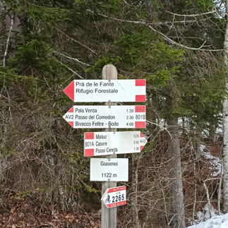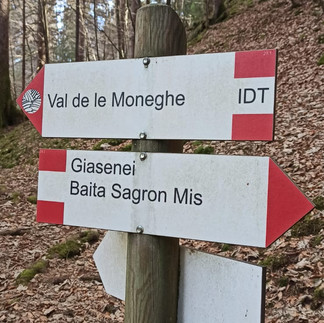 📌 Dall'Hotel Chalet Giasenei (1.100 m.) si scende leggermente verso valle e in corrispondenza della palestra di roccia, si intraprende a destra il sentiero "IDT Val de le Moneghe" (Inizio IDT Intrecci del tempo), si seguono sempre le indicazioni "Val de le Moneghe", si attraversa in leggera discesa un piccolo e grazioso ruscello, dopo il quale si trovano altri due segnavia "Val de le Moneghe ". Alla terza indicazione dirigersi verso "Forcella dell'Omo / Val de le Moneghe", fino alla località "Rònch de la Costa" (1.034 m.). Si procede sempre per "Val de le Moneghe", fino ad un bivio dove bisogna guardare l'indicazione posta sul retro del segnavia che indica "Rònche de le Giasene / Prà de le Fante", che sale in discreta pendenza verso destra. Si arriva ad una piccola baita in località "Rònch de le Giasene" (1.185 m.), si procede fino alla località "Pra de le Fante" (1.244 m.) continuando in direzione "Rifugio Forestale / Baita Sagron Mis" fino ad arrivare al Rifugio Forestale Val de le Moneghe (1.265 m.). Si procede in direzione "Baita Sagron Mis / Sagron", raggiungendo un altro bivio, dove ci si dirige a destra verso "Prà de le Fante / Sagron ", raggiungendo località "Prà de le Fante" (1.292 m.). Si procede per il sentiero n. 801 B direzione "Giasene / Sagron/ Sentiero Italo Zecchini", raggiungendo località "Giasene" (1.122 m.) seguendo infine l'indicazione per "Matiuz / Casere / Passo Cereda" sentiero n. 801 A, fino a ritornare all'Hotel Chalet Giasenei.